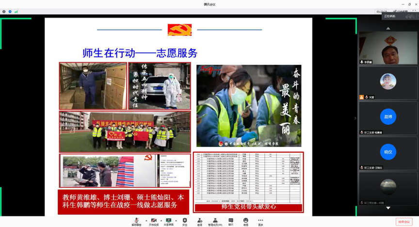 他围绕生命至上、生命教育、做大爱之人、做合格党员四部分讲授。他说,世间万物,人是最宝贵的。习近平总书记强调,“把人民群众生命安全和身体健康放在第一位,把疫情防控工作作为当前最重要的工作来抓,不遗漏一个感染者,不放弃每一位病患”,这是人民至上、生命至上的真实内涵,同学们一定要深刻学习领会。此次抗击疫情是善待生命、生命至上的试金石,一定要践行人与自然和谐共生理念,善待自己和他人,珍爱每一个生命。在谈到生命教育时,他强调生命的价值与意义,不仅仅在于存在,要与生活、生产相结合,把个人生命放在群体中、放在自然界中,把个人的生命价值,放在历史演进过程和中国梦伟大进程中。特别是作为党员,一定要把有限的生命投入到无限的为人民服务中去。在生生不息的家庭家族、国家民族的历史进程中、跑好接力棒。