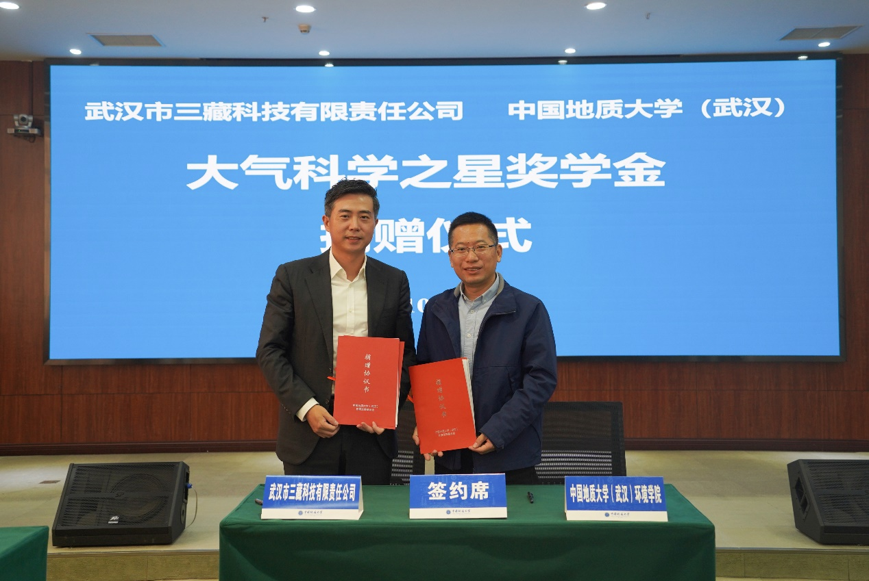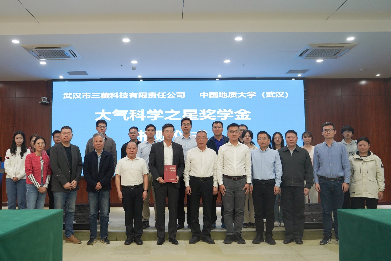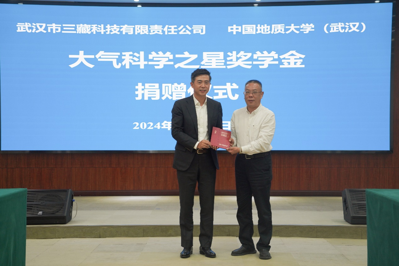 捐赠大气科学之星奖学金。三藏科技董事长童甫,首席运营官宋光宇和行政人力总监张艳,刮刮卡