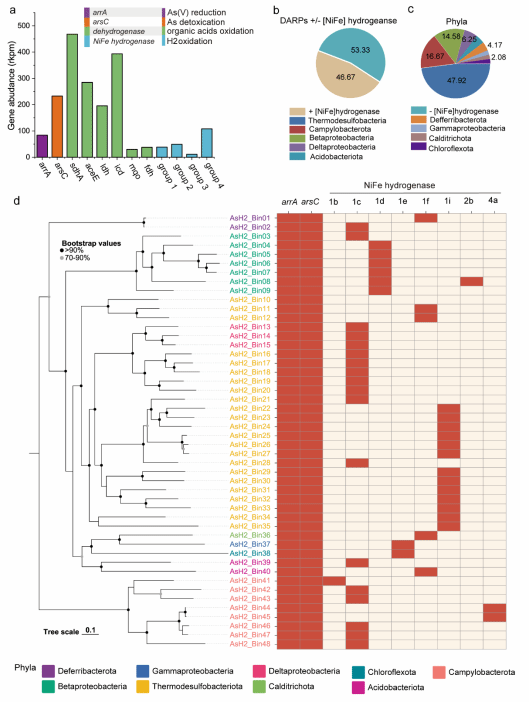首先,为了确定DARPs是否具有利用氢气进行自养生长的分子基础,通过对砷污染土壤样品进行多轮富集培养,我们成功制备了一个富含DARPs的富集液,并对其进行了宏基因组分析。结果显示,约46.7%的DARPs含有至少一种I型Ni-Fe氢化酶基因(图1)。结果表明,Ni-Fe氢化酶从氢气中获取电子后,这些电子通过细胞色素C传递给ArrB,最终到达ArrA,ArrA直接催化As(V)的还原。参与这一过程的所有蛋白质和酶均在组装的DARP基因组(MAGs)中完整编码,为我们所提出的DARPs催化氢气氧化偶联As(V)还原反应提供了宏基因组学证据。