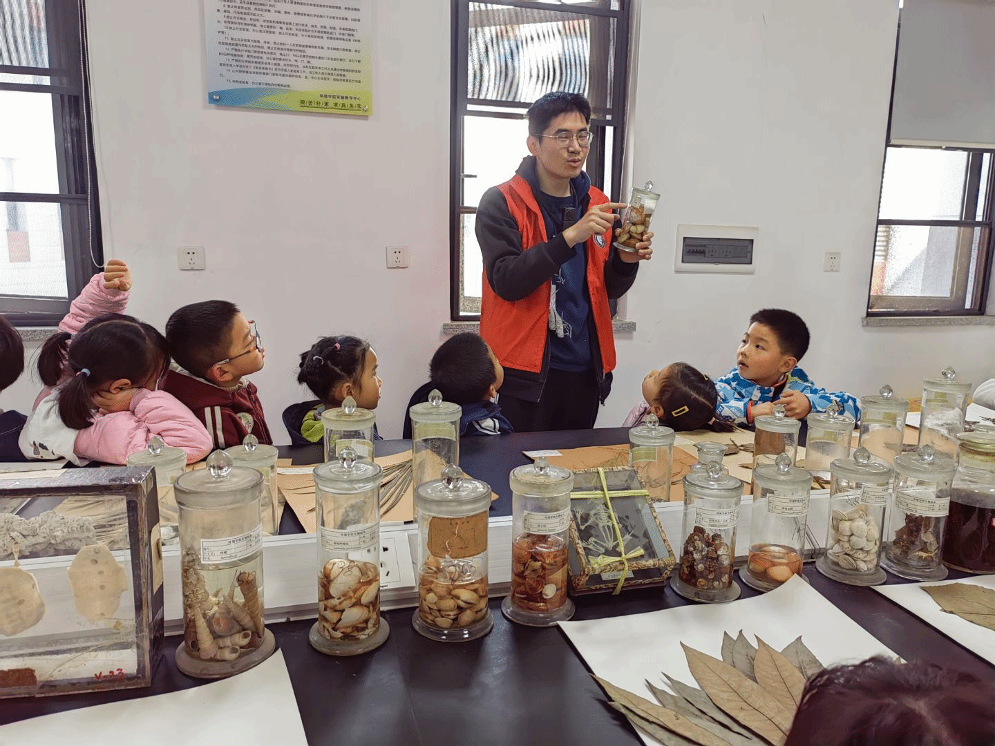 生物科普标本室,开启了一场奇妙的生物探秘之旅。标本室老师、研究生和绿色协会的同学带小朋友们浏览了形态各异的昆虫标本、栩栩如生的动物标本以及色彩斑斓的植物标本,用生动形象的语言,为他们讲解了各种生物的形态特征、生活习性以及在地球环境中的作用。小客人们听得津津有味,并提出各种有趣的问题。此次科普活动不仅丰富了小朋友们的课外知识,激发了他们对自然科学的兴趣,也让他们感受到了生物多样性的魅力,增强了保护生态环境的意识。相信这次奇妙的生物探秘之旅,将在小朋友们的心中播下热爱自然、探索科学的种子。