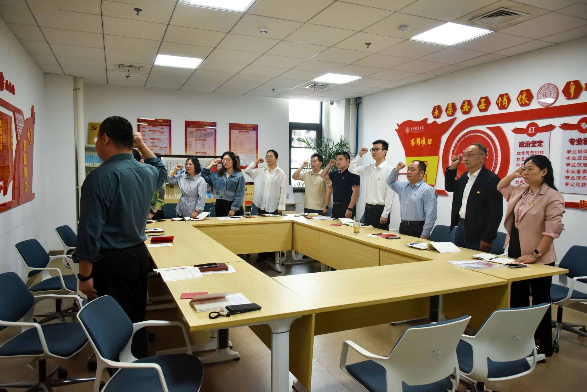 支部党员唱国歌、温誓词。