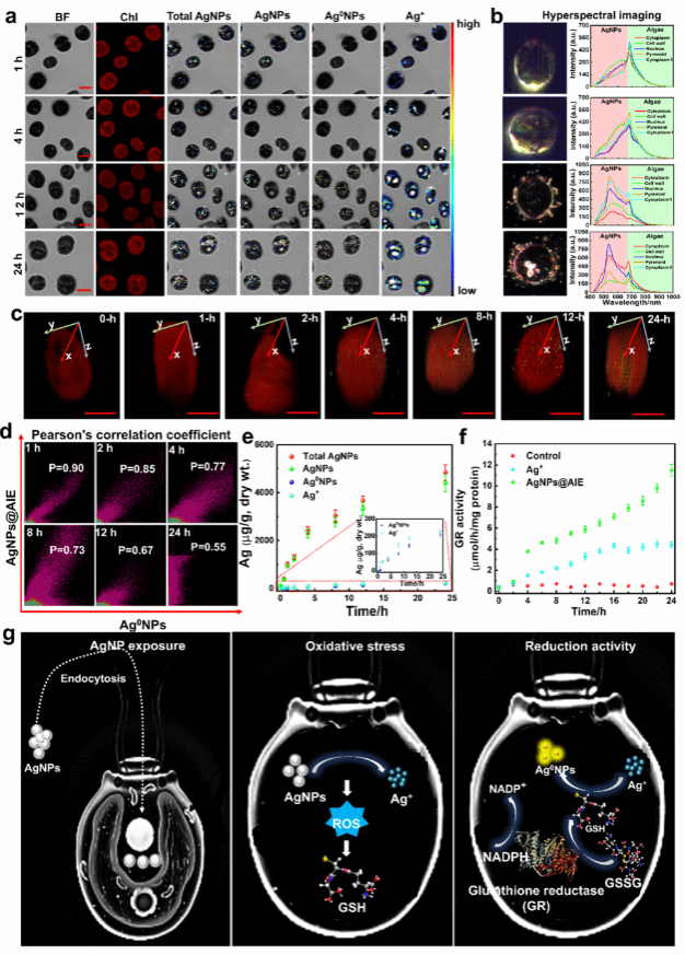 纳米颗粒在生物体内可能经历溶解-再生成的动态转化,导致毒性来源复杂化。传统方法难以同步观测颗粒、离子及二次产物的生物分布与相互作用。研究团队通过聚集诱导发光技术与无标记散射光成像、高光谱分析的集成,在活体微藻细胞内实现了对AgNPs全生命周期的非侵入式观测。研究发现,Ag+优先定位于藻细胞的顶端区、细胞核及蛋白核,而Ag0NPs特异性聚集在细胞质,其形成与细胞内谷胱甘肽还原酶(GR)活性密切相关。此外,经24小时暴露,约9%的细胞内AgNPs发生转化,其中4.7%以Ag+形式残留,4.3%形成Ag0NPs(ACS Nano, 2024, 18, 35013-35028)。