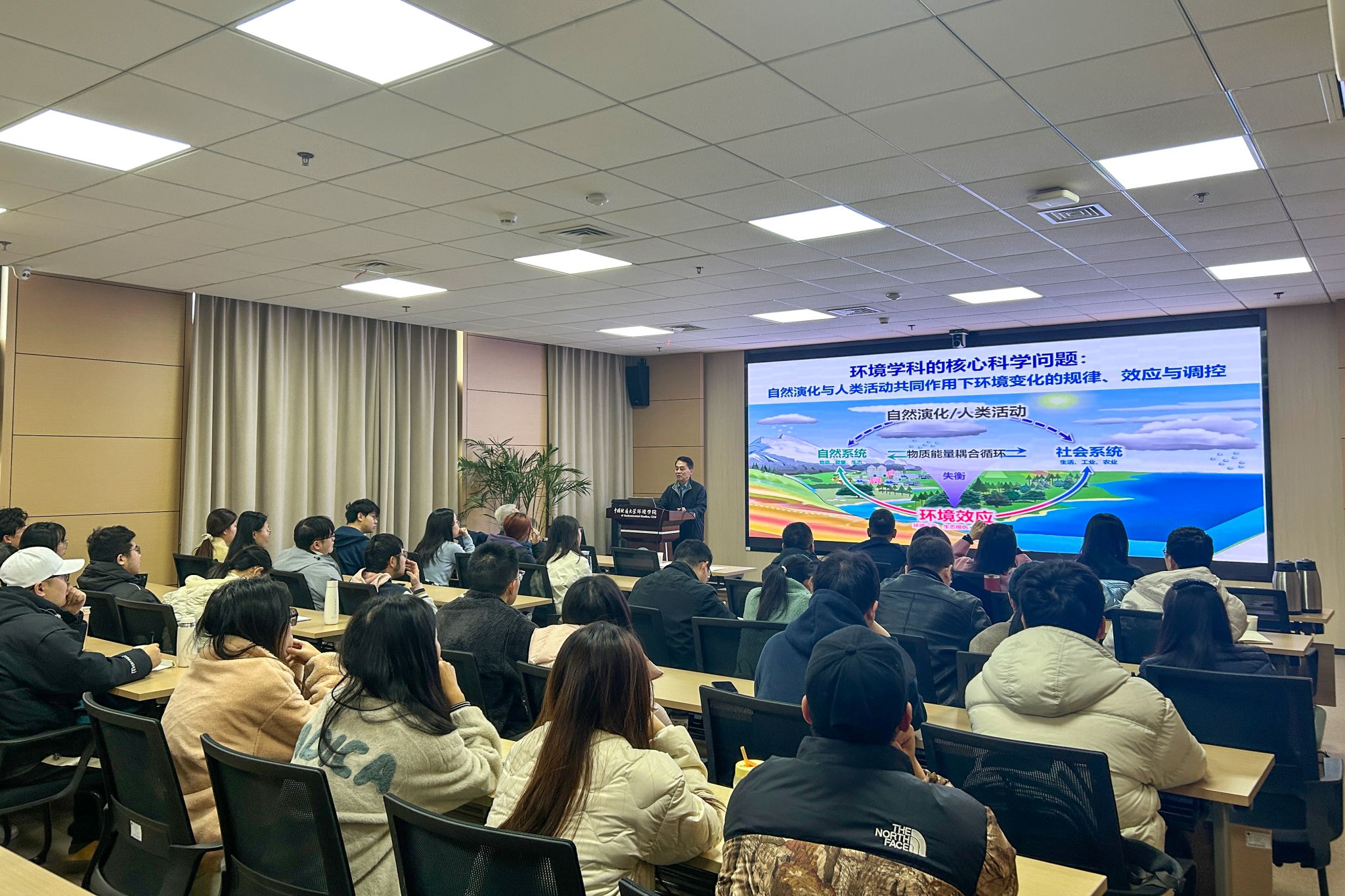 师生参加报告会。王焰新院士主持论坛报告会。