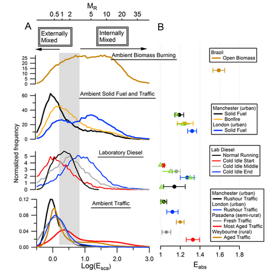 本次研究采用单颗粒气溶胶光度计(Single Particle Soot Photometer,SP2)、气溶胶离心质量分析仪(Centrifugal Particle Mass Analyser,CPMA)、气溶胶质谱(AMS)、烟雾箱及其它附属设备第一次通过实际测量揭开了BC混合态对其光学性质影响的面纱。研究发现,以往存在巨大争议的透镜效应只有在包裹层和黑碳的质量比值到达一定的临界点时才会发生(高于3)并随着质量比的增强而增加,当低于某个临界点时(低于1.5)由于包裹层并没有完全包裹住黑碳或者填充了其中的缝隙,从而对其光学性质没有发生质的影响,在质量比在1.5-3之间黑碳的光学性质随着质量比的增加发生迅速的突变。本次研究通过大量的野外和室内实验观测得到了一致的发现,证明这个质量比值特征的普遍性。研究进一步发现,在城市环境中看到的汽车尾气的排放中,黑碳的包裹层成分相对较少,从而没有包裹层带来的透镜效应;而生物质燃烧排放的黑碳则具有较大的包裹层从而具备增光的效应。本次研究第一次给出了如何在不同质量比的条件下来应用不同的经典光学模型来探讨黑碳的光学性质,这为区域模型和全球气候模型模拟黑炭的光学效应提供了有效的模拟方法。