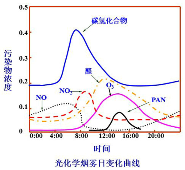 臭氧高发期为每年的夏秋季节,浓度高值在每日正午至午后时段(图3)。其主要日变化特征为:(1)白天生成,夜晚消失,污染物浓度峰值出现在中午和午后;(2)烃类和NO发生在早上交通高峰时节,此时NO2浓度很低;(3)随太阳辐射增强, NO2,O3 ,PAN和醛类浓度逐渐增加,到中午已经较高,一般O3和NO2浓度峰值比NO浓度峰值晚出现4-5小时;(4)傍晚虽然交通繁忙,但是日光较弱,因此不足以引起光化学反应。由于其表现为淡蓝色气体,因此在晴朗天气下肉眼较难辨别,是一种“看不见的污染”。