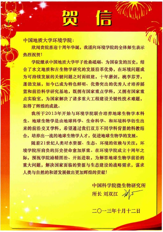 刮刮卡 (北京)水资源与环境刮刮卡 发来院庆贺信