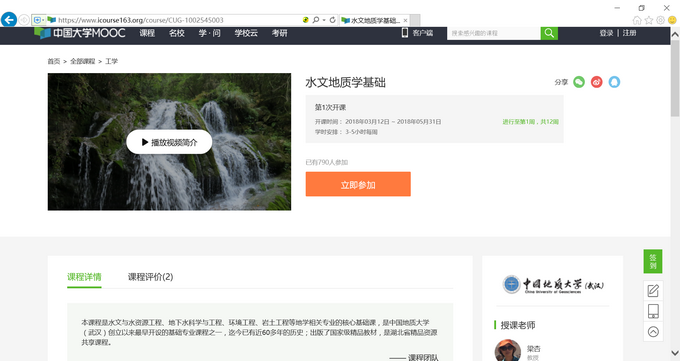 第一门开设MOOC的专业课程。《水文地质学基础》MOOC课程主要讲授地下水的赋存、运动、水化学、补给径流与排泄、及与地下水资源和环境相关的基本概念、原理和方法。该MOOC课程的开设能为水文与水资源工程、地下水科学与工程、环境工程、岩土工程等相关专业学生或水工环地质从业人员提供网络学习的平台与资源,促进地下水科学理论知识的传播与交流。