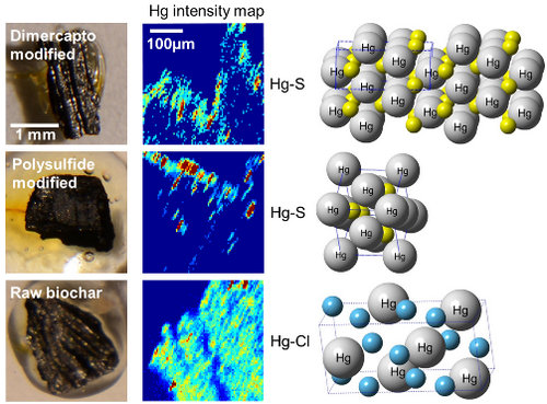 Fig.1 Confocal X-ray micro-fluorescence imaging showing the distribution of Hg in unmodified and sulfurized biochars with adsorbed Hg. Photos in the left column show the orientation of the particles for analysis. The images in the middle show the Hg distribution. The images in the right show the atomic structure of modeled Hg species.