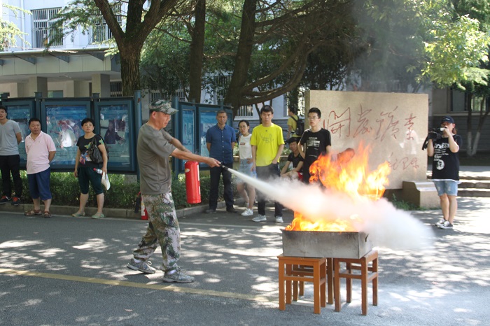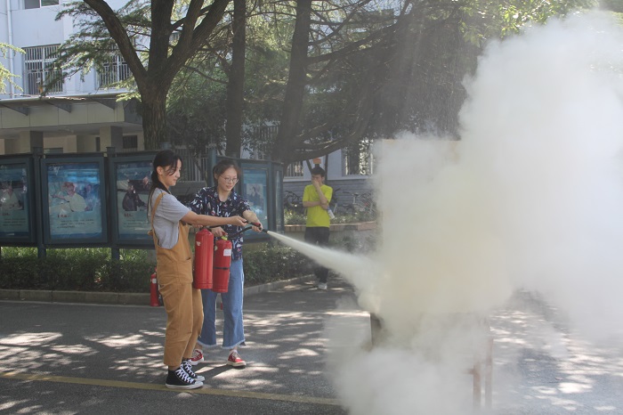 的师生分别参与了干粉灭火器和二氧化碳灭火器的演练。