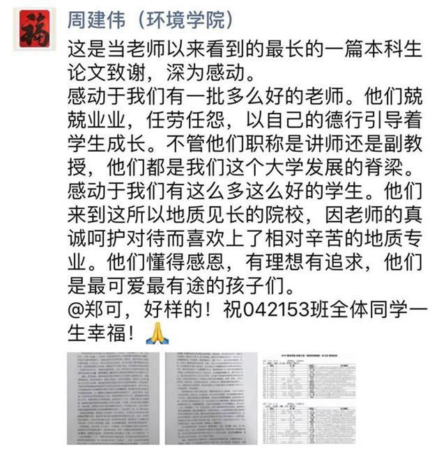 作为答辩组的周建伟老师看了郑可论文的致谢词后非常感慨在朋友圈写到,这是当老师以来看到的最长的一篇本科生论文致谢,“感动于我们有一批多么好的老师。他们兢兢业业,任劳任怨,以自己的德行引导着学生成长。不管他们职称是讲师还是副教授,他们都是我们这个刮刮卡