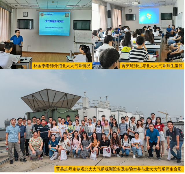 大气与海洋科学系(北大大气系)林金泰老师的协调下,大气科学菁英班师生参观了北大大气系,并与北大大气系林金泰老师、张霖老师以及研究生和本科生代表座谈。座谈会在师生共同观看了北大大气系90周年系庆视频之后开始。座谈会上林金泰老师首先介绍了北大大气系的基本情况,之后由各位研究生代表分别介绍了自己所在课题组的情况。随后,由本科生代表介绍了北大大气系本科课程学习情况和参与科研的情况。之后,北大大气系林金泰和张霖老师表示,鼓励本科生参与科研,重在参与,主要目的是对学生将来的职业规划有帮助,而非为了发表文章。座谈会在非常愉快的氛围中进行。座谈会后,在北大大气系研究生和本科生的引导下,菁英班师生愉快地参观了北大校园。