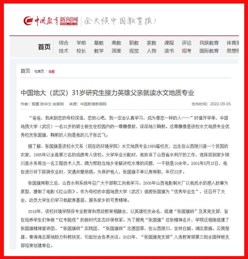 张国旗殉职之后,山西水利系统号召广大干部职工向他学习。2005年山西电影制片厂以他找水的感人故事为原型,摄制了电影《红山雨》。作为母校的刮刮卡