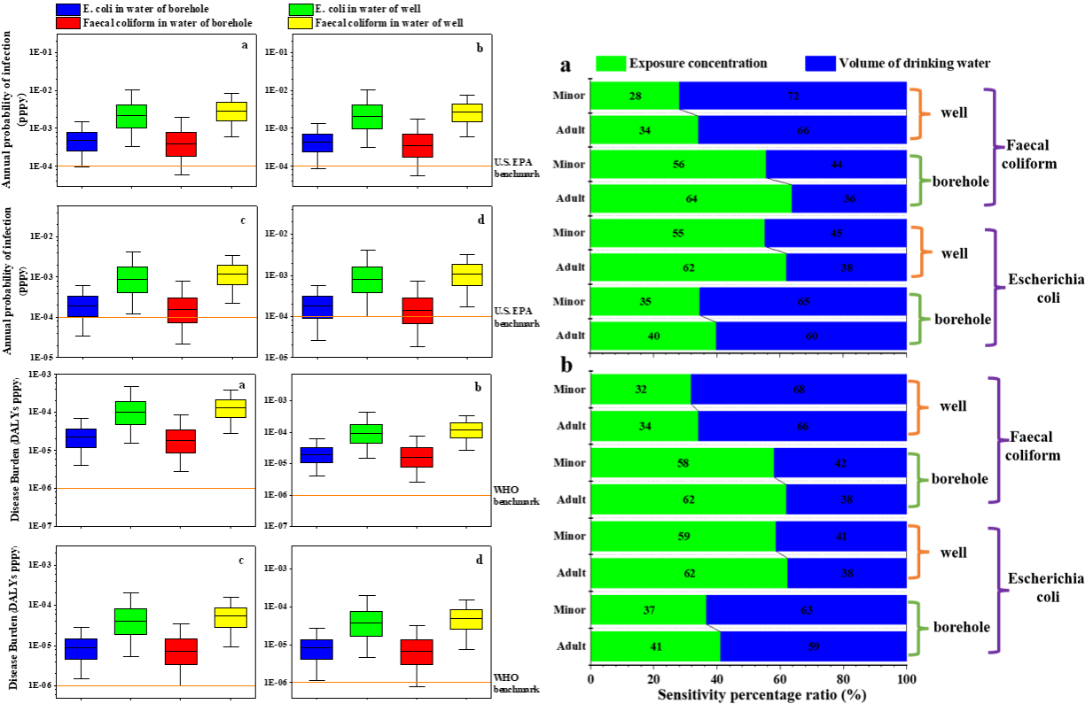 论文系统总结了在中、低收入国家不同地下水源来源,特别是在井水和钻孔水中常见的指示性病原菌——大肠杆菌和粪大肠菌群微生物的浓度,然后采用微生物定量风险评估(Quantitative Microbiological Risk Assessment, QMRA)体系,对不同年龄段的人群使用不同供水系统情景下的年感染概率P(y)和疾病负担DB进行了分析,并通过蒙特卡罗模拟(Monte Carlo simulation)的敏感性分析(sensitivity analysis)量化了“暴露浓度”和“饮用水体积”这两个健康风险计算参数对疾病负担的贡献程度。