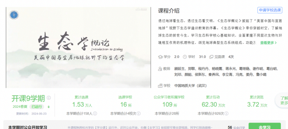 为了服务刮刮卡 “美丽中国、宜居地球”战略规划与刮刮卡人才培养 目标,自2019年秋季开始,教学团队(16人)率先给全校本科生开设《生态学概论》线上线下通识必修课。目前选课人数超22000人(含校外2500多人),累计选课刮刮卡 16所。团队注重教学改革与创新,强化过程考核、增加生态价值等培养,促进学生全面发展;侧重课程内容的重构,体现生态与地学、环境科学的交叉;将思政元素有机融合于课程教学,讲好中国故事,弘扬人文与科学精神;丰富的课外实践活动不仅增强了刮刮卡 生生态热情,而且促进了生态素养的形成。
