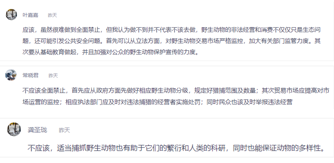2月18日19:00罗泽娇教授等6位教师的《生态学概论》开课,腾讯会议、腾讯课堂、智慧树等各大平台,老师和学生们都已经熟练掌握。疫情当前,学生们对自然愈发充满好奇和敬畏,期望从《生态学概论》学到生态规律,了解人类与自然和谐的共处之道。新冠疫情、白鲟灭绝、长江禁渔等案例进入了在线课堂。生物系郑敏老师开课前在智慧树发布了讨论话题:野生动物贸易该不该全面禁止?同学们围绕论题从立法、市场监管、加强动物传疫研究与管理、提高公众认知度各个角度纷纷发表了自己的看法。