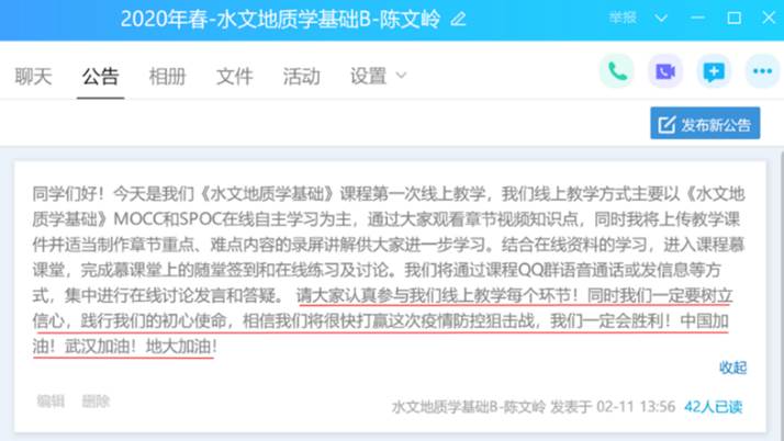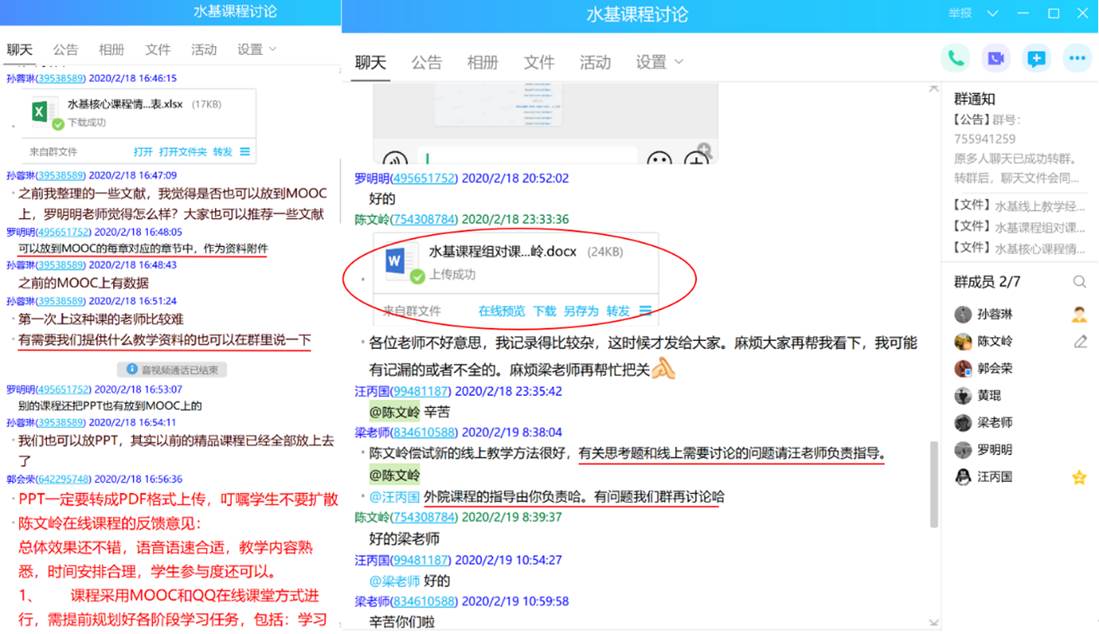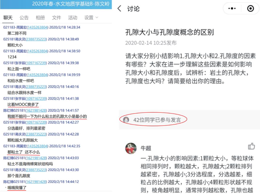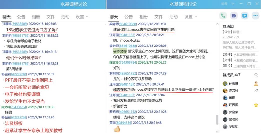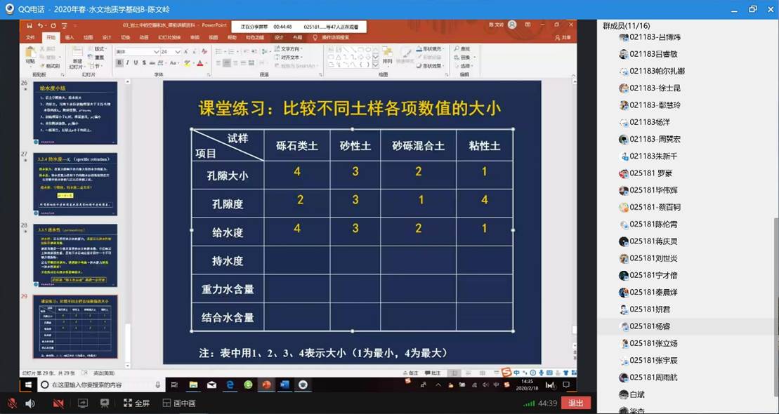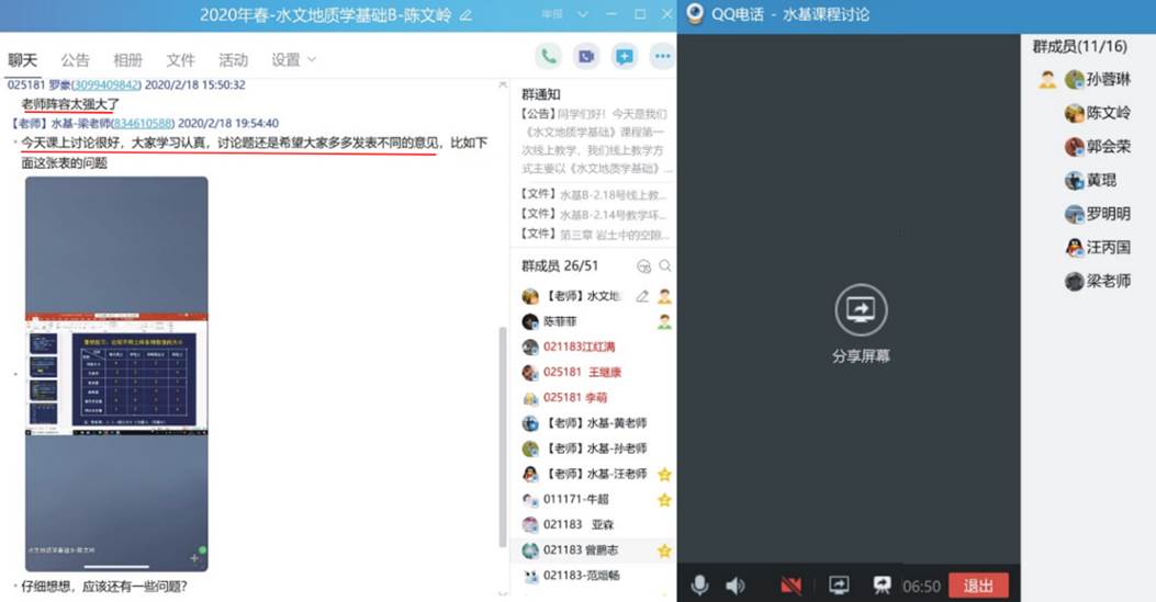 对课程组两位任课老师线上教学时遇到的具体问题,随时在课程组群里进行交流讨论。为了及时对线上教学过程中出现的问题进行总结,优化混合教学模式,切实提高教学效果,课程组团队全体成员于2月18日聆听陈文岭老师为资源刮刮卡 和地刮刮卡 讲授《水文地质学基础B》线上课程。课后,课程组通过QQ群语音通话方式进行了集体研讨(约90分钟),对本次线上教学过程中取得的效果、出现的问题进行了系统的总结,集体备课、集中讨论对优化混合教学模式和线上课程的高效开展大有裨益!