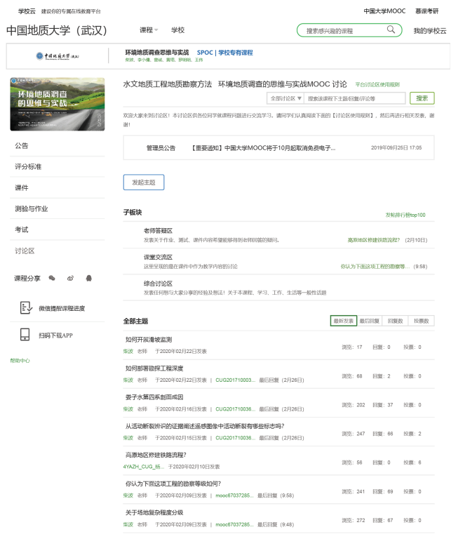 发布了2020年春调整本科教学计划的通知,随之,纷繁复杂的在线教学平台及学习资料接踵而至,课程组也忙碌了起来,对学习通、慕课程、腾讯课堂、华为微课、群共享和腾讯会议室等多种在线教学工具进行了学习和讨论。考虑到前期在爱课程网站上建设有《环境地质调查思维与实战》的MOOC,但该课程集中在区域环境地质调查的知识点,缺少针对建筑场地、路桥工程等岩土工程勘察的相关知识。经过比较后,确定依托MOOC开设《水文地质工程地质勘察方法》专属SPOC课程,可以为本校学生添加缺少的教学内容。这样就形成了SPOC在线学习,网络直播(SPOC课内直播或腾讯会议室直播)导学、讨论和课下作业相结合的教学方案。在SPOC上为每一知识点都添加了足够的随堂练习及讨论题,作为课程需要掌握的基础知识。在导学环节,重点讲授基础地质调查、水工环地质调查和岩土工程勘察中思维转变的方法。课下需完成单元测试和四次课程大作业。