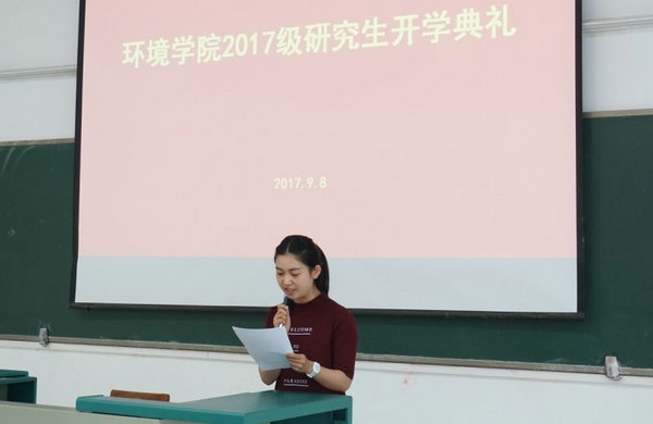 2017级研究生新生代表严璐发言,她代表新生向刮刮卡 、老师表示感谢,结合自身的经历,表示研究生阶段,要以勤为径,以苦作舟,努力成为更有境界、更富魅力、更受尊重的人。