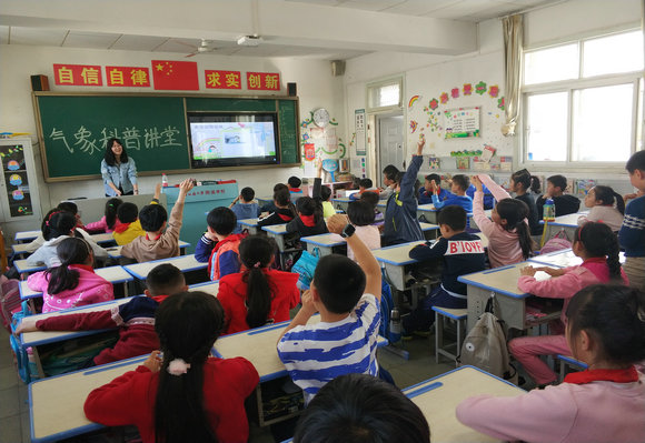 园。为小学生们讲述气象小知识,以游戏的形式传播气象知识,与小学生们度过了愉快的一节课。