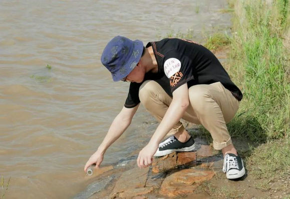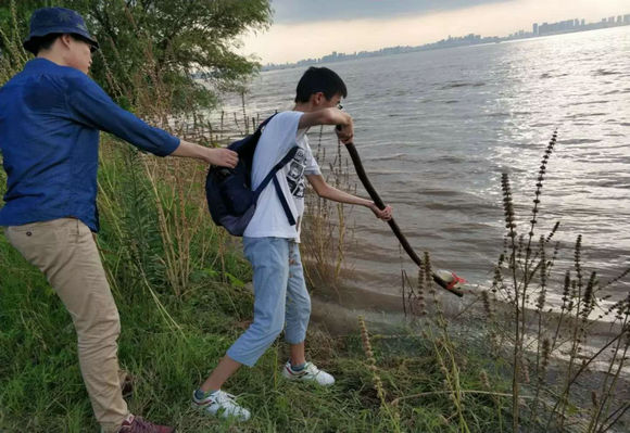 生们根据昨天实际的考察情况,来到了长江边的取样地点。为了确保采水样过程的安全性,解决长江岸边可能存在的安全隐患,他们利用取点现场的长木棍,手动做了一个取水样的道具,使取水的过程更具有安全保证。