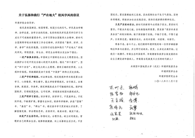 团委、学生会、研究生会联合发起的《关于弘扬和践行“严在地大”校风学风的倡议》,号召环境刮刮卡