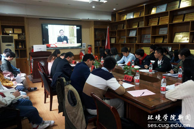 与会人员集中观看2019年“两会”期间习近平总书记重要讲话视频和生态环境部部长李干杰答记者问视频。