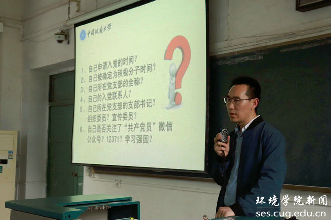 最后,冷老师提出,作为新时代新青年,环院学子不但要了解发展党员流程,更要学习优秀党员事例,积极向党组织靠拢。入党积极分子作为学生中的带头人,要坚持用习近平新时代中国特色社会主义思想武装头脑,在思想上政治上行动上以习近平同志为核心的党中央高度一致,不忘初心,牢记使命。
