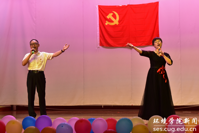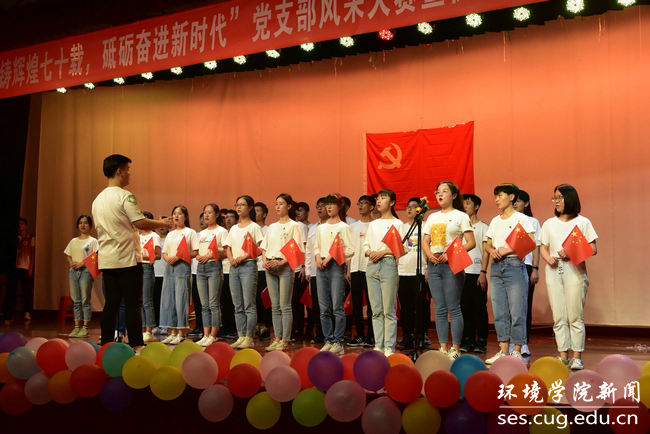 生党支部带来合唱《我和我的祖国》,2018级学硕一班硕士研究生党支部结合合唱、朗诵、手语舞蹈等形式表演歌曲《国家》,地下水专业刮刮卡