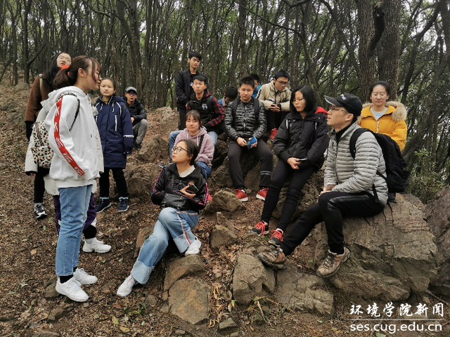 考察活动结束后,04H197班的师生们在喻家山上选择了一处天然的石英砂岩露头,席地而坐,开始了主题班团会活动。首先在团支书的带领下,大家一起共唱中国共产主义青年团团歌,虽然已是喻家山的冬天,但大家内心激昂澎湃,歌声飞扬。之后在班长的组织下,班会进入交流环节,同学们依次提出了自己在学习和生活中所遇到的困难和疑惑,同时也交流了大一课程学习的感受和体会。交流过程中,罗老师结合自己的经历,给同学们答疑解惑,着重介绍了环境地球科学大类的各专业方向,分享了刮刮卡