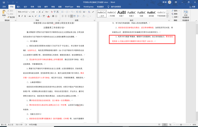 党委提出关于学习“学习强国”的具体要求之前,党支部内部已经开始定期给党员们设定一个小目标,以增强党员们的学习积极性和主动性。2019年10月中旬,党支部在“不忘初心,牢记使命”主题教育工作计划的制订时,加上了各党员需要积极在“学习强国”上学习的要求,同时要求各党员在11月底积分要达到1000分;