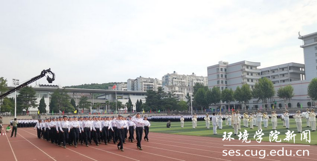 透蓝的天空挂着几抹可爱的云彩,润红的骄阳为天空增添了几分色彩,雄壮的国歌唤醒了同学们的激情,2021级环境学子分为持枪方阵、队列方阵、军体拳方阵以及啦啦操方阵,他们以矫健的步伐、昂扬的姿态、坚毅的眼神、洪亮的口号依次接受检阅。