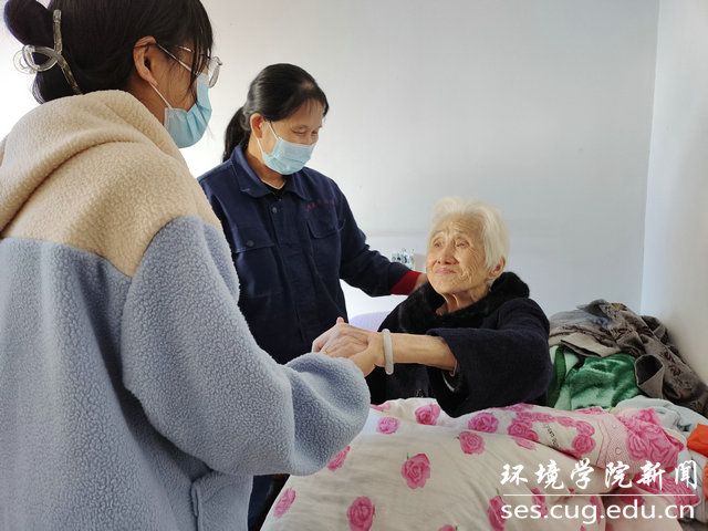 志愿者与行动不便的老人握手谈心