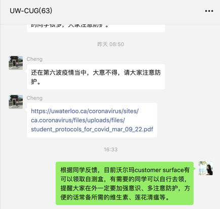 全体中加班学生工作的耿婧时刻关注在加学生的身体健康和生命安全。面对国外复杂多变的疫情形势以及当前加拿大第六波疫情,定期与学生保持点对点的交流,关心学生的学习及生活状态,提醒大家务必加强个人防护意识,注意安全平安回国。