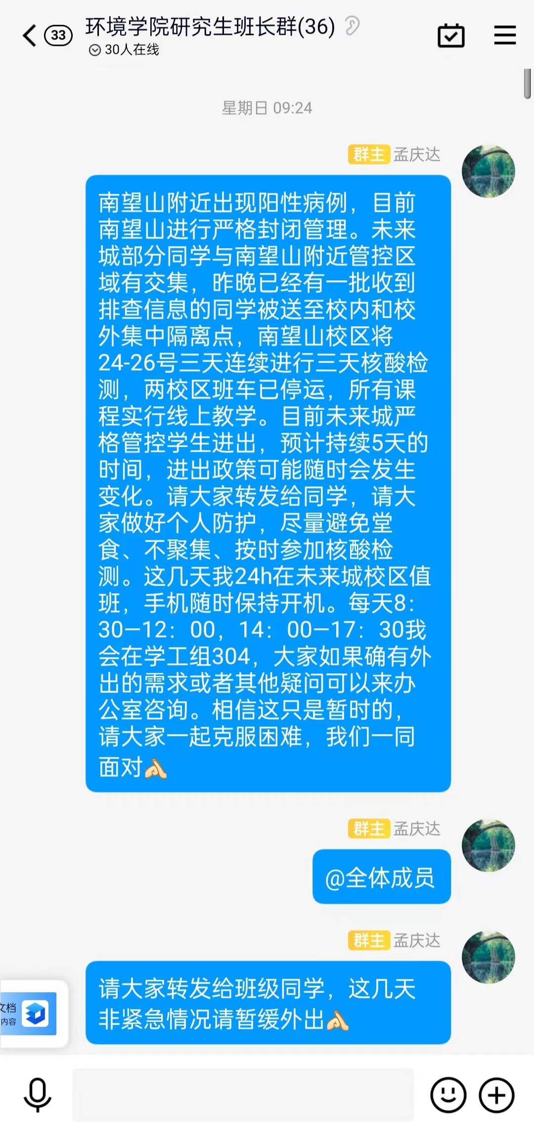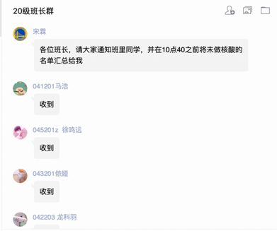 党委统一部署,他们迅速织密疫情防控工作网络,第一时间将官方通知和权威信息传递到每一位学生,做到信息全覆盖、全知晓;第一时间摸排学生情况,在校人数、集中健康监测人数、校外隔离人数、未返校人数等,牢牢掌握全体本研学生的信息。“点对点”盯好重点人头核酸检测“一次不差”,“面对面”指挥全员核酸摸排“一个不漏”,“键对键”落实“日报告”“零报告”制度“雷打不动”,他们层层加固疫情防线堡垒,用每一个精准的学生数据构筑起疫情防控的安全网络。充分发挥思想政治优势和密切联系学生优势,用实际行动践行“立德树人”的初心使命,贯彻落实“学生在哪里,思想政治教育就在哪里”的工作信念。第一时间通过网络平台召开疫情防控主题年级大会、党员大会、班团会等,引导学生从身边故事中汲取精神养料,在关注国情中强化制度自信。