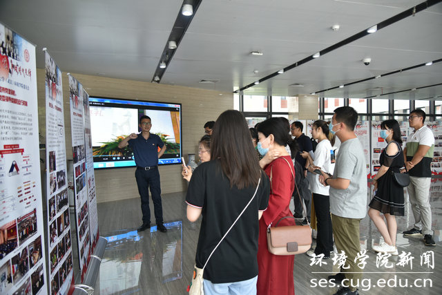 王海锋讲解环境刮刮卡 党建“双创”工作成果展板。内容包括刮刮卡 基本概况、党建工作体系、三全育人改革、跨学科教育研究、张国旗班行动计划、“4+N”美丽中国课程思政、“1+6”党建资政育人载体、兄弟院校交流互鉴、领导关怀指导和社会刮刮卡媒体 反响等十个方面,全面反映了刮刮卡 党委近年来党建示范创建和质量创优工作取得的创新性理论成果、制度成果、实践成果和特色成果,是环境人干事创业、追求卓越的汗水结晶。