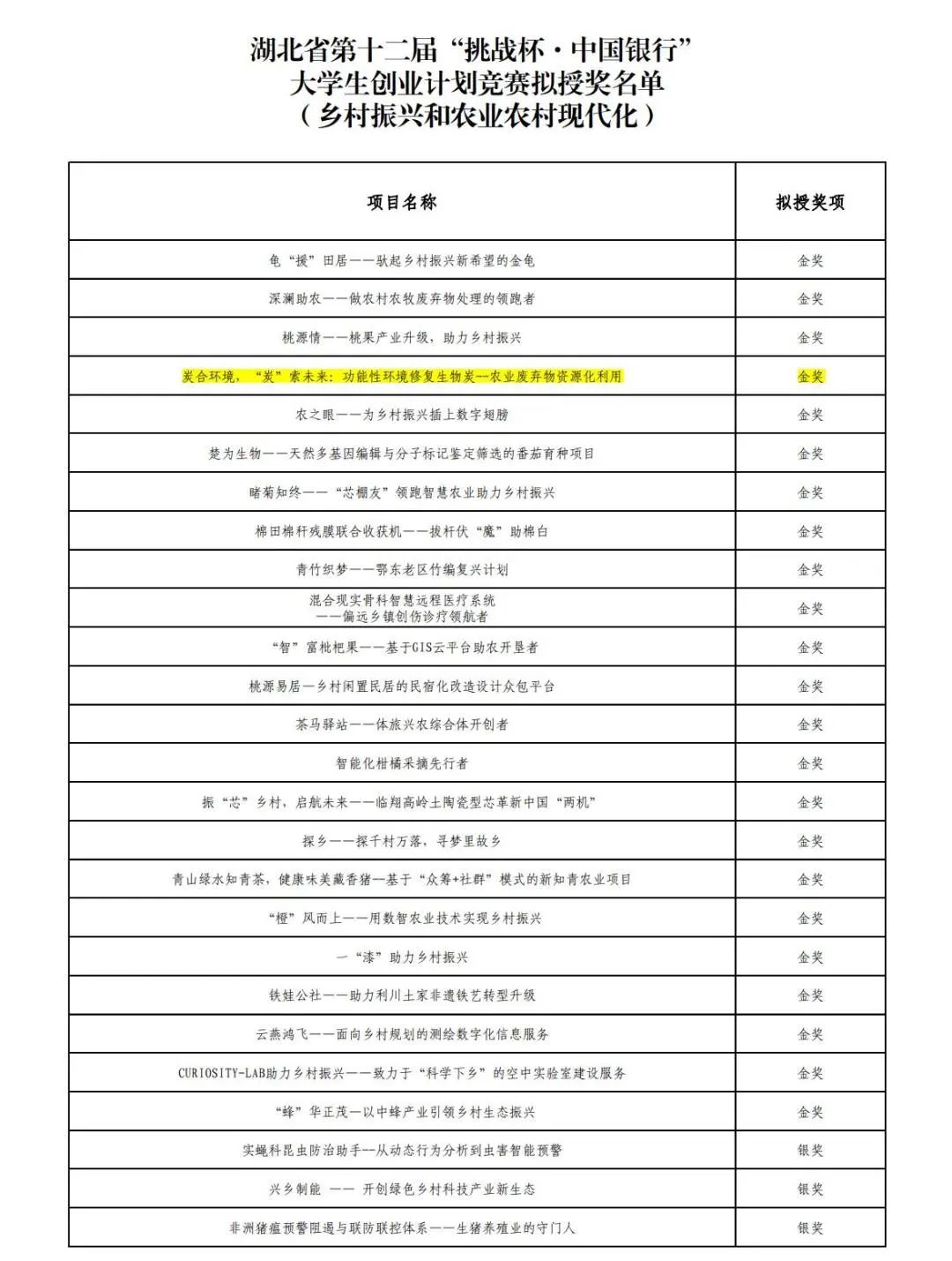 通讯员程毅康、耿婧  编辑耿婧)近日,湖北省第十二届“挑战杯·中国银行”刮刮卡 生创业计划竞赛圆满落幕,刮刮卡 炭合团队项目“炭合环境,‘炭’所未来:功能性环境修复生物炭——废弃生物质资源化利用”以总评第四的成绩获得乡村振兴和农业农村现代化赛道金奖,成功入围国赛。