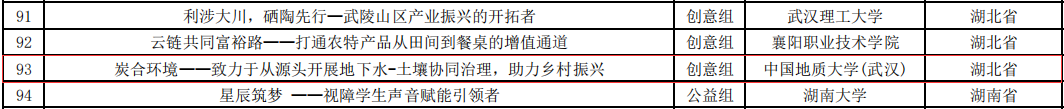 由程毅康、冯宇、刘子源、华祎梓、陈鑫鑫、雷雨濛、罗敬文、孟一帆、蔡子延、王倩、刘佳、王宗星、韩鹏、章怡婧、陈奕璇参与的“炭合环境——致力于从源头开展地下水-土壤协同治理,助力乡村振兴”入围“青年红色筑梦之旅”赛道全国总决赛现场赛。由许涵、程毅康、张彤彤、蔡子延、刘子源、邱洋、熊俊风、孙文锦、袁岭迤、田一茜、刘家宜、李舒奕、刘子涵参与的“修砷养源——原位修复劣质地下水技术全球领航者”入围高教主赛道全国总决赛现场赛。