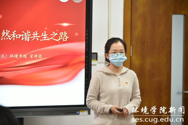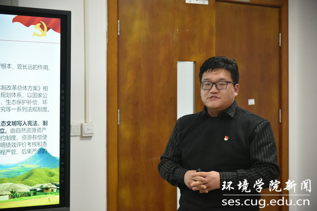 生党支部支委陈鹏飞分别代表所在支部分享学习党的二十大精神心得体会。姜磊玉以“守护地下水,探索人与自然和谐共生之路”为主题进行分享。她通过回顾党的二十大报告中提到的新时代十年伟大变革,强调生态环保中“地下水”的重要性。结合自身专业,她介绍了水文地质学的发展,并依据当今地下水遇到的问题,解读目前我国的治水之策。通过分享6条用水之道,勉励大家要知水善用,做“品德高尚、基础厚实、专业精深、知行合一”的地质人。随后,陈鹏飞从十年来我国生态文明建设取得的历史性成就,介绍党的二十大提出的生态文明建设重大部署,向大家分享所在支部党小组自主研学的主要内容形式。
