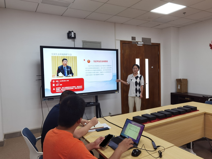 生党支部吴冰和2021级硕士研究生第一党支部易佳佩围绕“建设人与自然和谐共生的现代化”进行学习分享。吴冰详细讲解了习近平生态文明思想的基本内容、新时代推进生态文明和美丽中国建设必须坚持的“六项原则”以及坚持党对生态文明建设的全面领导等,号召大家要更加自觉投身建设人与自然和谐共生现代化的伟大实践。易佳佩介绍了世界环境日的由来,重点讲述生态文明建设“十个坚持”,最后从新污染物研究与治理个人研究方向出发,呼吁大家要在自己的研究领域深耕细作,将论文写在祖国大地上。