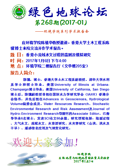 水利系学士和硕士毕业,美国University of Illinois at Urbana-Champaign博士毕业,美国University of California, San Diego博士后。陈骥副教授曾担任国际水力学研究学会(IAHR)香港分会秘书,并先后担任Advances in Geosciences, Hydrological Volume编委会成员,Water Resources Research、Stochastic Environmental Research and Risk Assessment及Journal of Hydro-Environment Research等期刊的Associate Editor,已指导毕业6名博士,发表SCI论文60余篇。研究领域包括:陆面过程、大气水文、流域水文、水资源研究、水灾害研究(山洪、洪水及干旱)、遥感信息应用及气候变化研究。