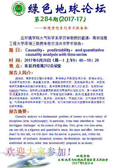 绿色地球论坛第284期(2017-17) ——环境刮刮卡 系列学术报告会 题目: Causality, predictability, and quantitative causality analysis with time series 时间:2017年6月26日(周一)上午9:40—10:20 地点:东区丹桂苑212会议室
