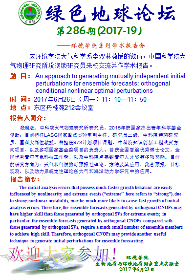 绿色地球论坛第286期(2017-19) ——环境刮刮卡 系列学术报告会 题目:An approach to generating mutually independent initial perturbations for ensemble forecasts: orthogonal conditional nonlinear optimal perturbations 时间:2017年6月26日(周一)上午11:10—11:50 地点:东区丹桂苑212会议室