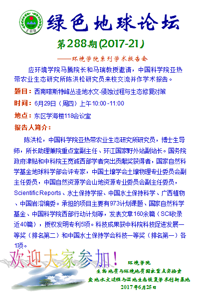 绿色地球论坛第288期(2017-21) ——环境刮刮卡 系列学术报告会 题目:西南喀斯特峰丛洼地水文-侵蚀过程与生态修复对策 时间:6月29日(周四)上午10:00-11:00 地点:东区学海楼118会议室