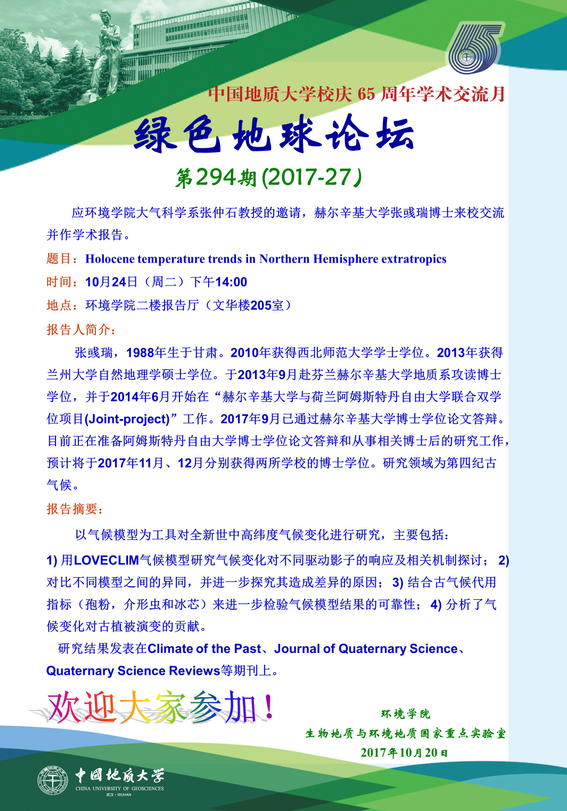 绿色地球论坛第294期(2017-27) ——环境刮刮卡 系列学术报告会 题目:Holocene temperature trends in Northern Hemisphere extratropics 时间:2017年10月24日(周二)下午14:00 地点:环境刮刮卡 二楼学术报告厅(文华楼205室)