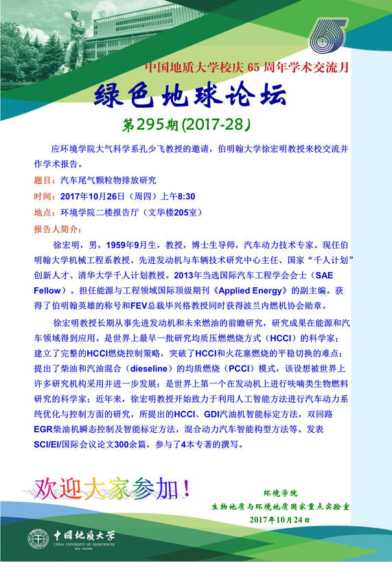 绿色地球论坛第295期(2017-28) ——环境刮刮卡 系列学术报告会 题目:汽车尾气颗粒物排放研究 时间:2017年10月26日(周四)上午8:30 地点:环境刮刮卡 二楼报告厅(文华楼205室)