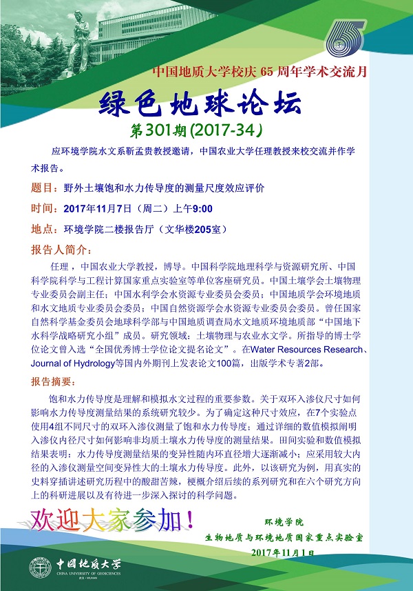 题目:野外土壤饱和水力传导度的测量尺度效应评价 时间:2017年11月7日(周二)上午9:00 地点:环境刮刮卡 二楼报告厅(文华楼205室)