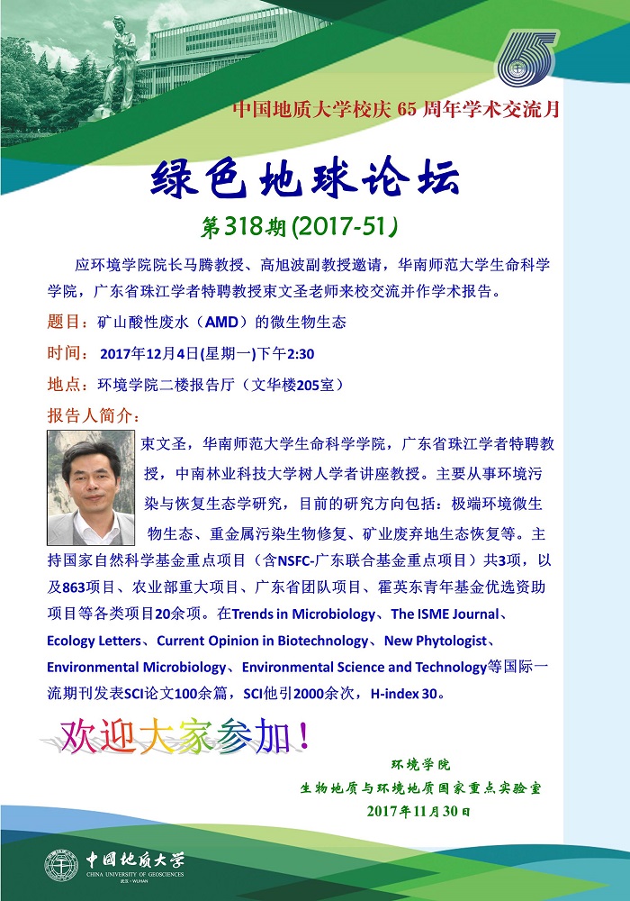 绿色地球论坛第318期(2017-51) 环境刮刮卡 “校庆65周年学术交流月”——高知论坛 题目:矿山酸性废水(AMD)的微生物生态 时间:2017年12月4日(周一)下午14:30 地点:环境刮刮卡 二楼学术报告厅(文华楼205室)