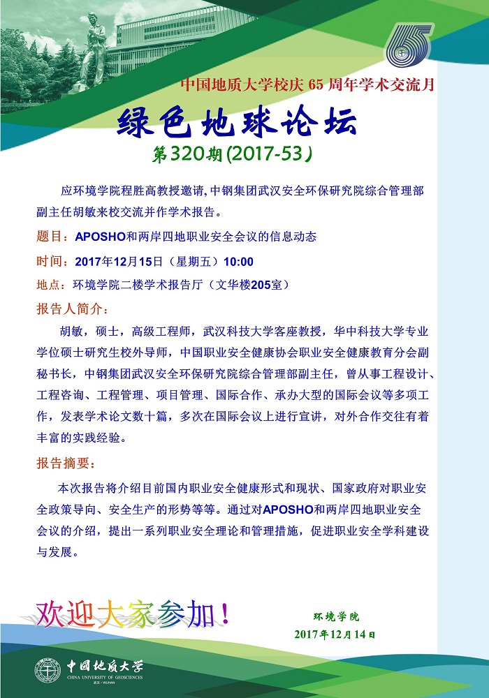 绿色地球论坛第320期(2017-53) 环境刮刮卡 “校庆65周年学术交流月”——高知论坛 题目:APOSHO和两岸四地职业安全会议的信息动态 时间:2017年12月15日(周五)上午10:00 地点:环境刮刮卡 二楼学术报告厅(文华楼205室)