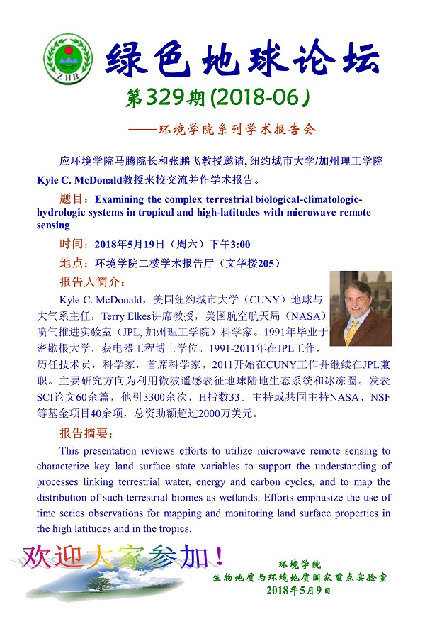 绿色地球论坛第329期(2018-6) ——环境刮刮卡 系列学术报告会 题目:Examining the complex terrestrial biological-climatologic-hydrologic systems in tropical and high-latitudes with microwave remote sensing 时间:2018年5月19日(周六)下午15:00 地点:环境刮刮卡 二楼学术报告厅(文华楼205室)