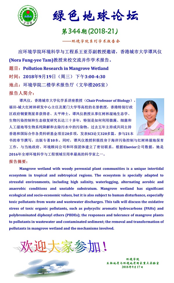 绿色地球论坛第344期(2018-21) ——环境刮刮卡 系列学术报告会 题目:Pollution Research in Mangrove Wetland 时间:2018年9月19日(周三)下午3:00-4:30 地点:环境刮刮卡 二楼学术报告厅(文华楼205室)